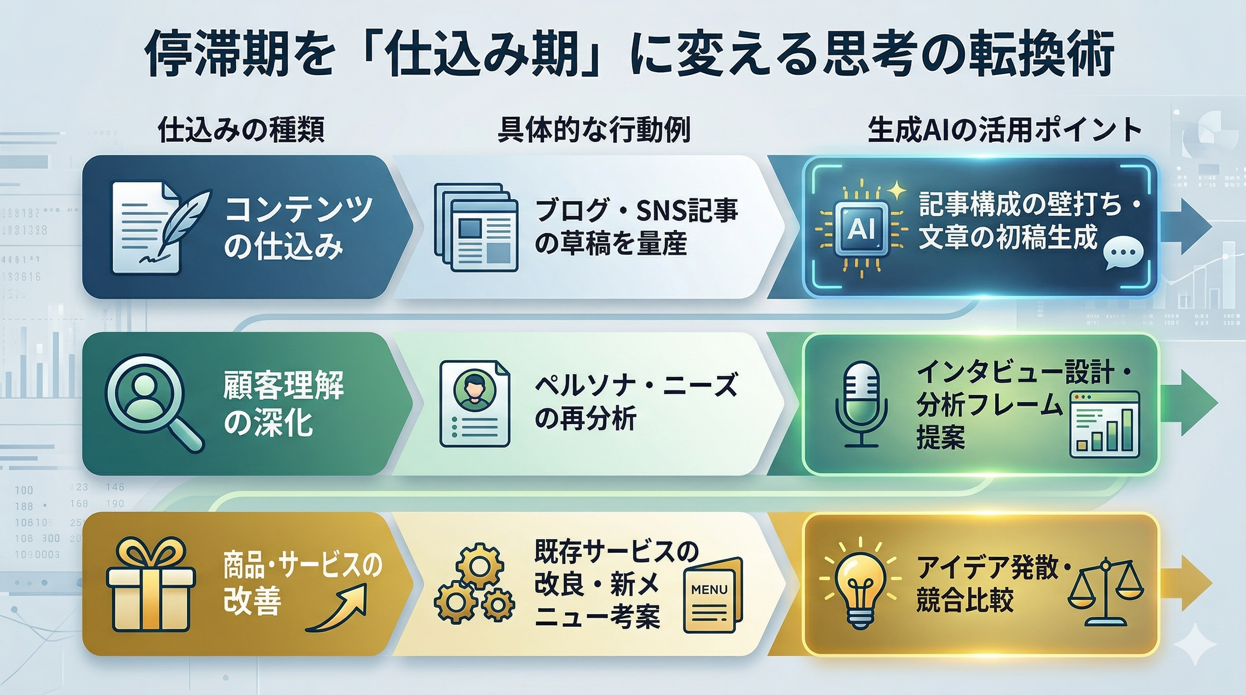 ・停滞期を「仕込み期」として使い、コンテンツ・顧客理解・商品改善に集中する